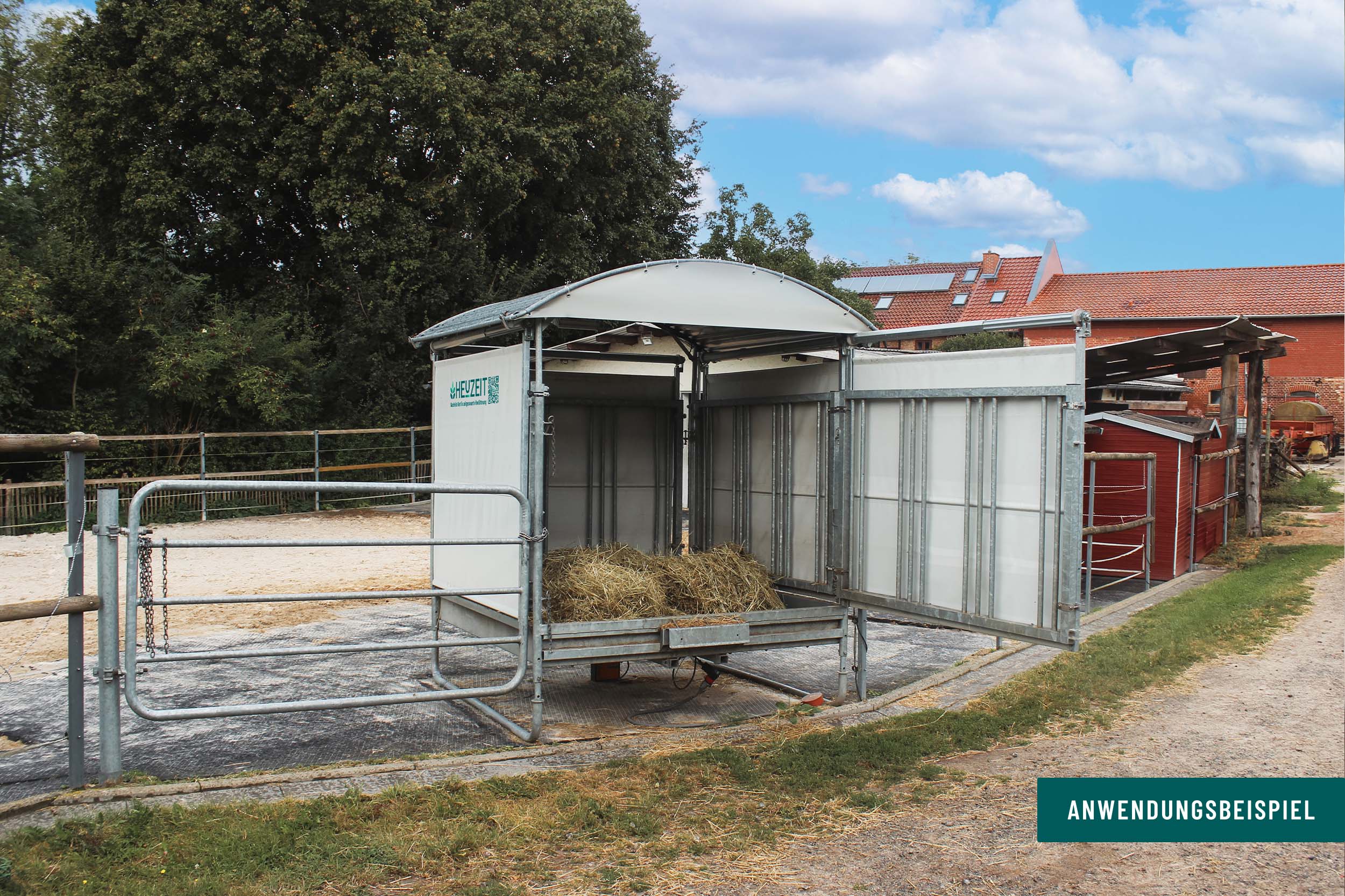 Das Verschließen erfolgt durch eine UV-beständige LKW-Plane mit einem Flächengewicht